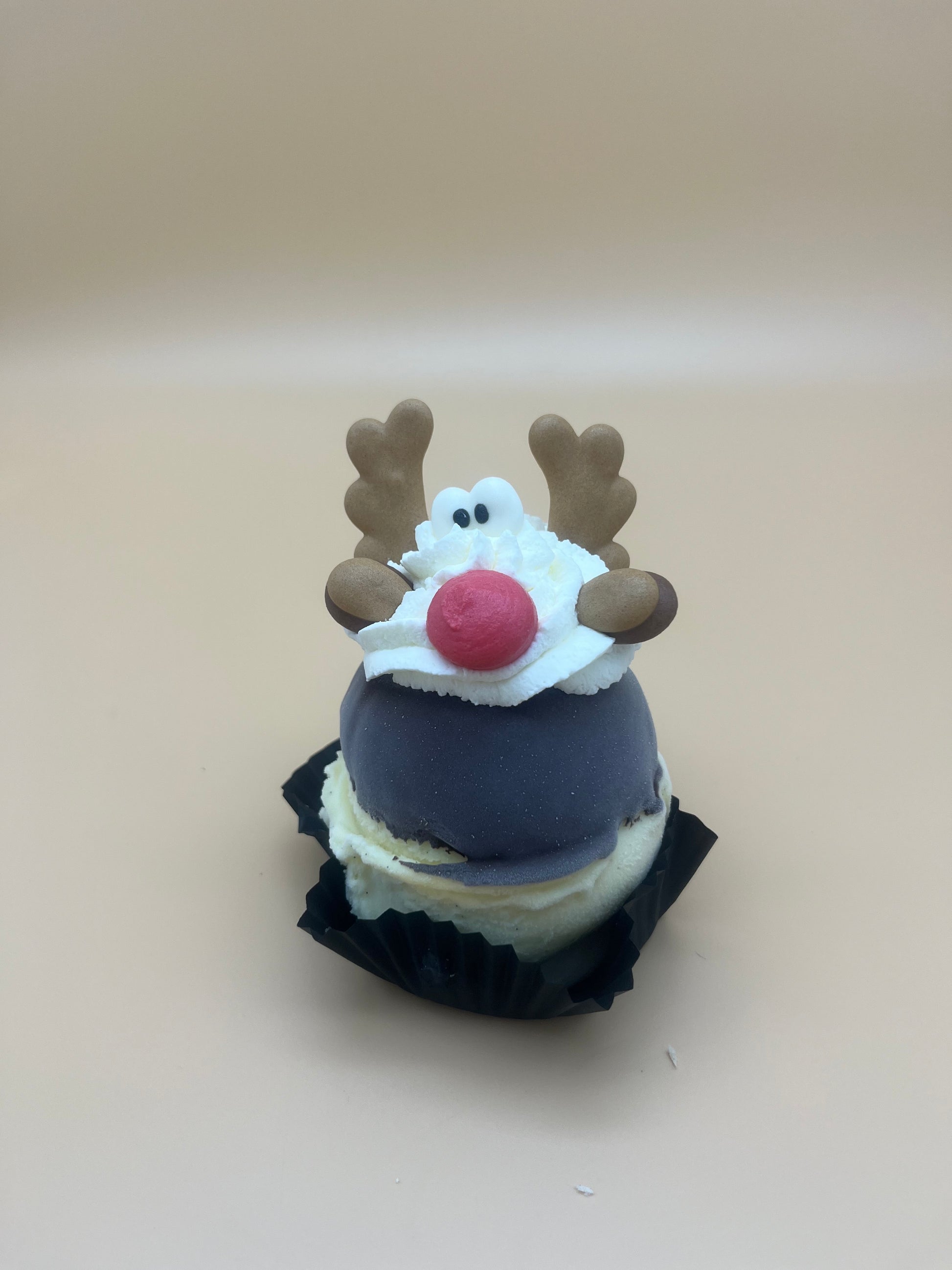 Vanille-ijs op een mirengue koekje afgewerkt met harde chocolade en Rudolf/rendier decoratie